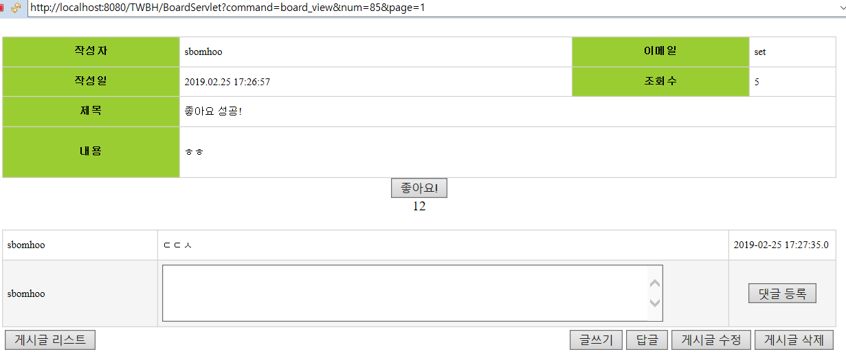 - BoardServlet 호출 command 구분해서 LikeUpdateAction으로 보냄