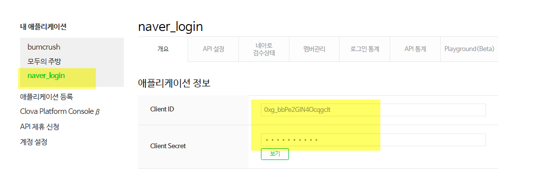 아까 등록했던 'naver_login' 애플리케이션이 만들어 진 것을 알 수 있습니다.