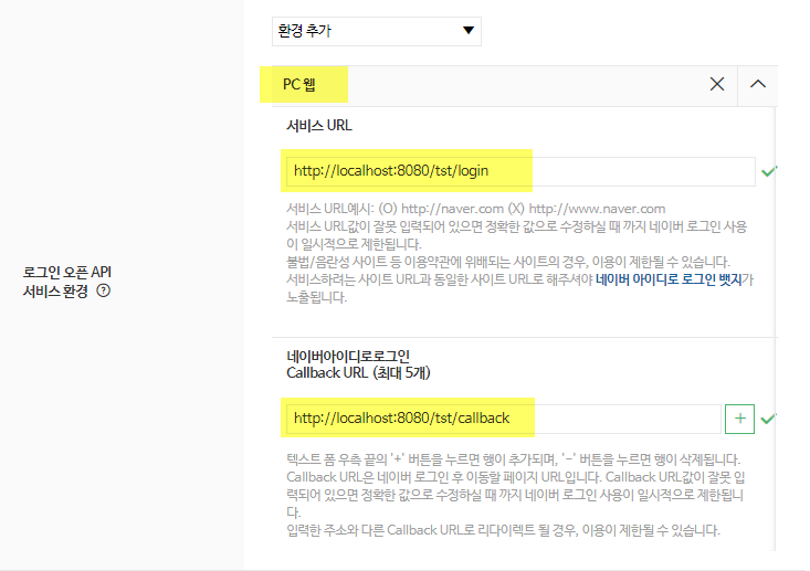 그리고 나면 서비스URL과 네아로Callback URL 추가하라고 나옵니다.