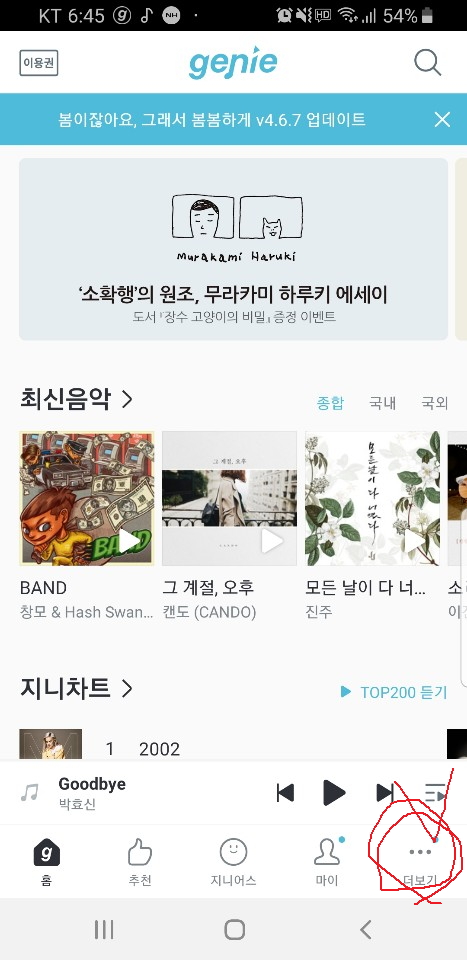 1. 지니 뮤직 어플 접속 -> 하단의 '더보기' 클릭