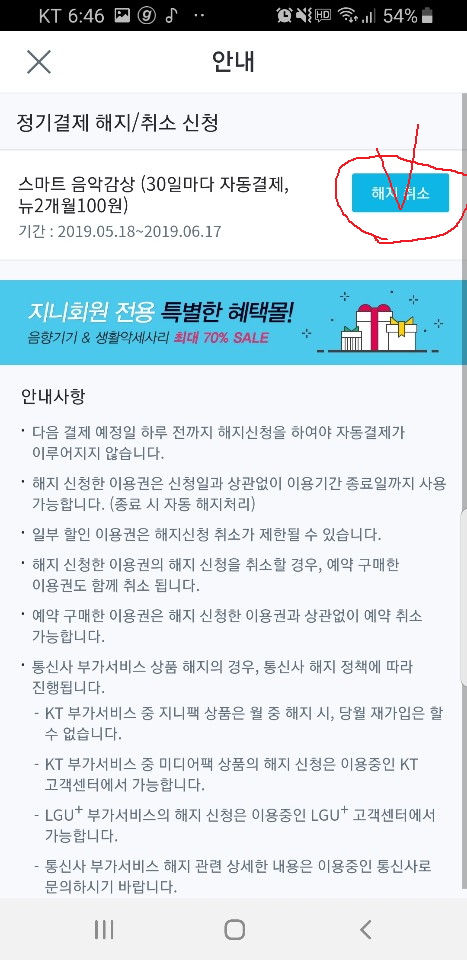지니뮤직 이용권 해지 신청을 해놔도 결제한 달까지는