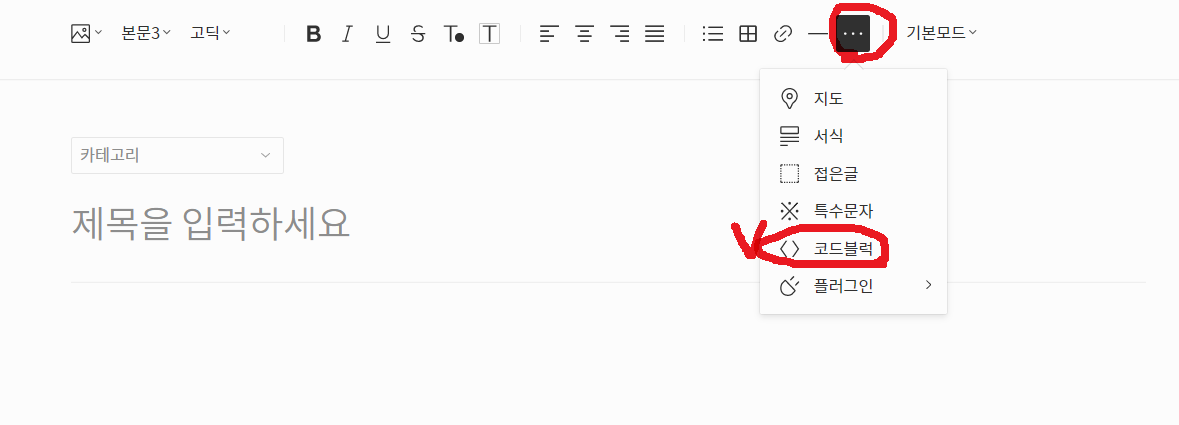 티스토리 신에디터에서 저 '...' 버튼을 클릭합니다.