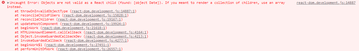 Uncaught Error: Objects are not valid as a React child (found: [object Date]). If you meant to render a collection of children, use an array instead.
