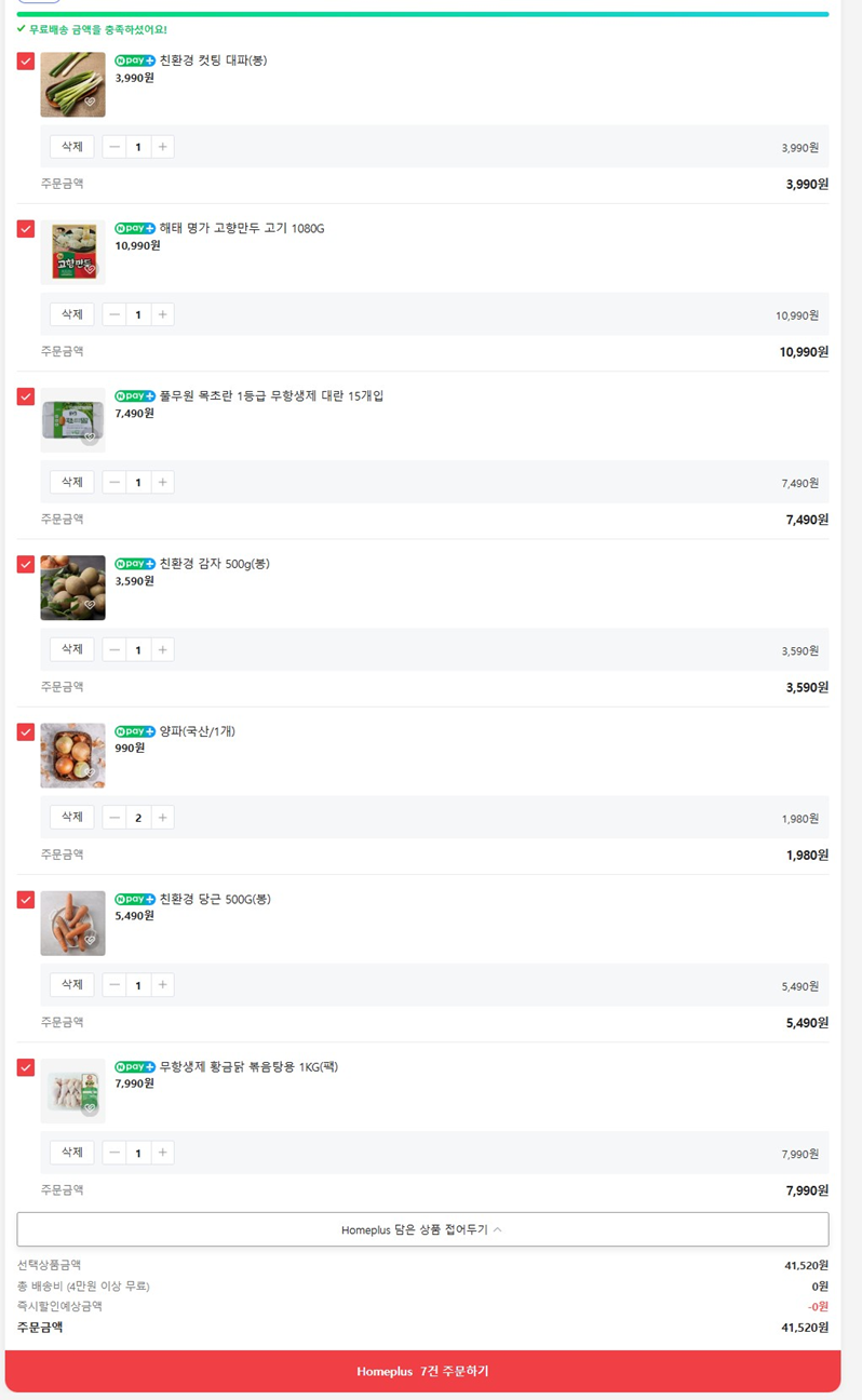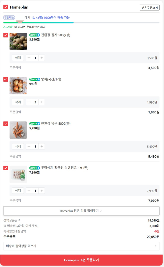 우선 네이버 장보기는 4만원이상부터 무료배송이기 때문에,