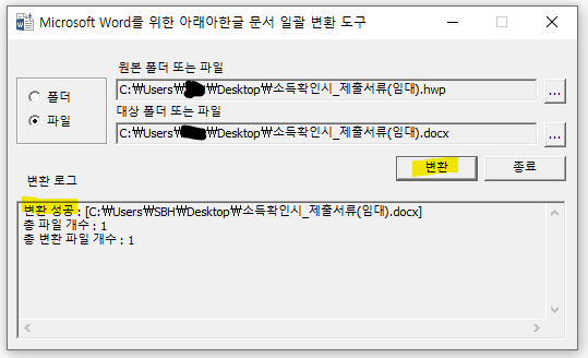 - 그리고나서 변환 버튼 클릭 하면 로그에 '변환 성공' 이라고 뜨면서 경로를 보여준다.
