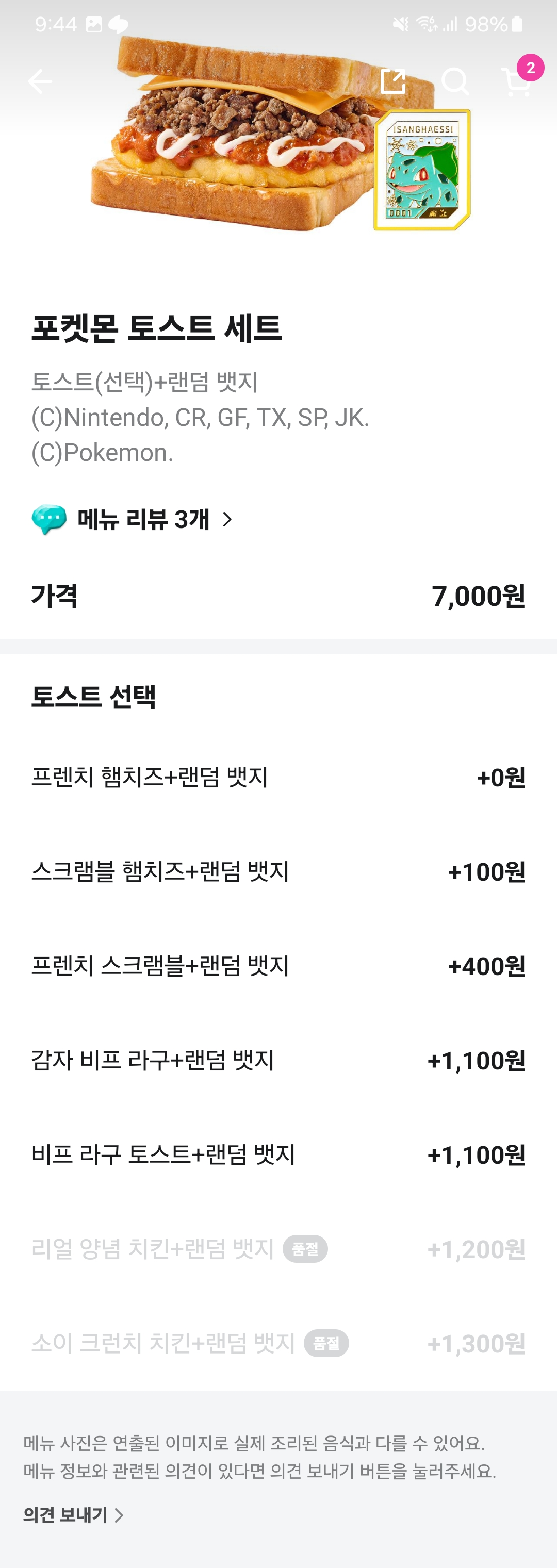 나는 뱃지가 목적이기 때문에 저렴하고 맛있는 프렌치 햄치즈 2개로 주문 ㅎㅎ