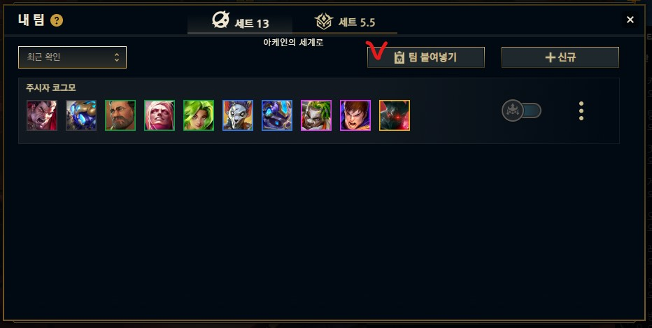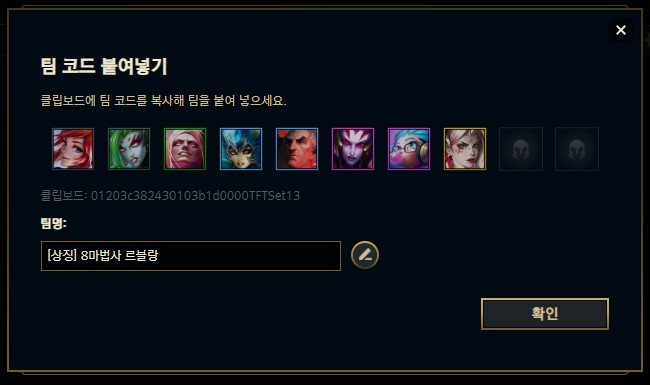 6. 팀 붙여넣기를 누르면, 아까 롤체GG 에서 복사한 팀 코드가 자동으로 붙여넣기 됨.