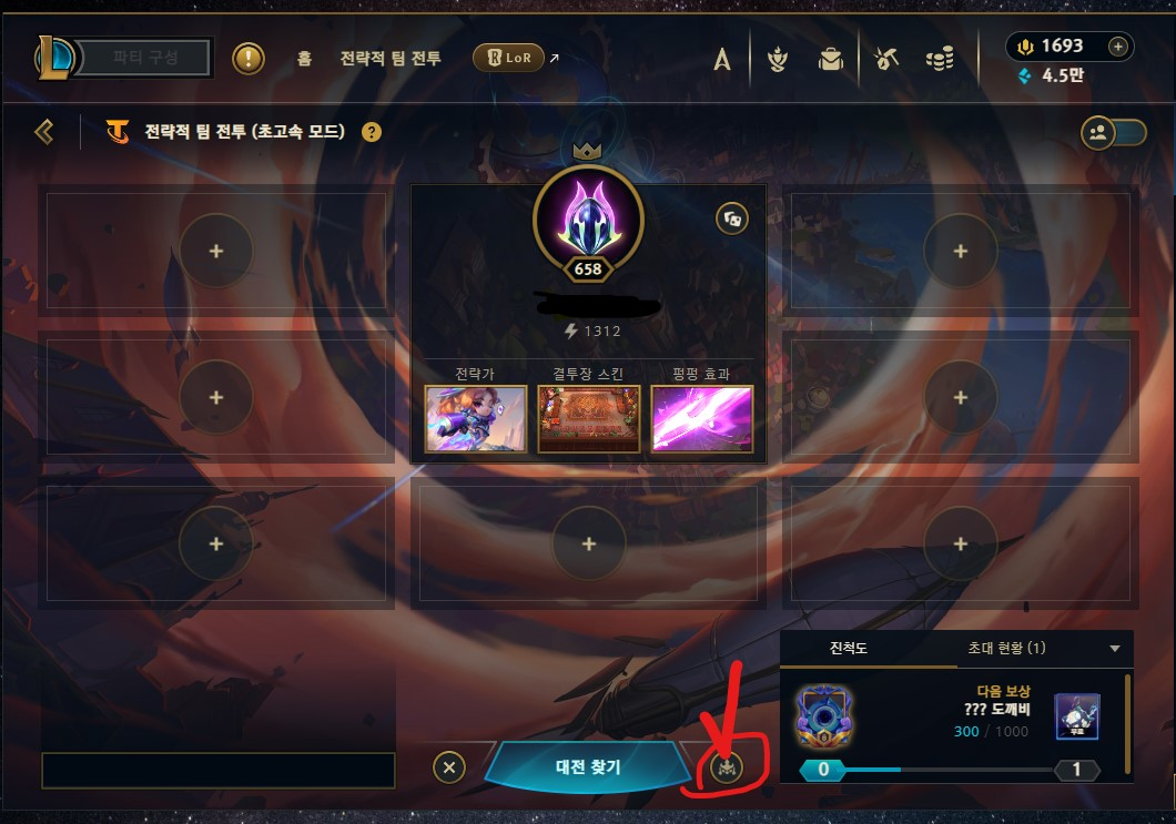 3. PC 롤토체스 접속 > 파티구성 화면 > 대전 찾기 옆에 '팀구성 (하단의 펭구 머리 모양 아이콘)' 클릭