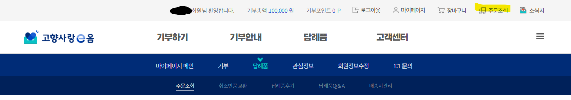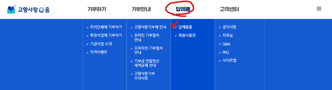 ✅ 2. 고향사랑e음 홈페이지 상단 메뉴 > 답례품 > 답례품몰