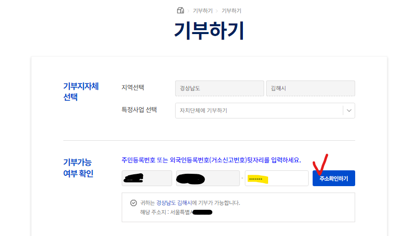 ✅ 4. 기부하기 페이지 > 주민등록 뒷자리 입력 후 '주소확인하기'