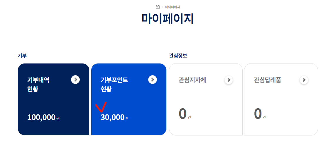 ✅ 10. 기부완료 > '마이페이지바로가기'에서 30,000포인트 들어왔는지 확인