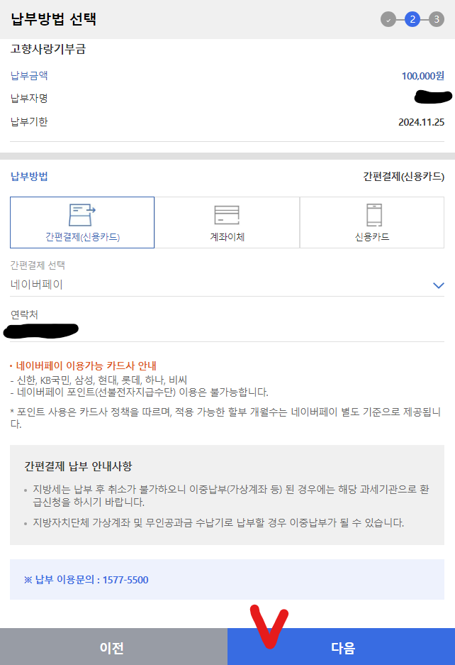 ✅ 9. 납부방법 선택 후 > 연락처 입력 > 다음