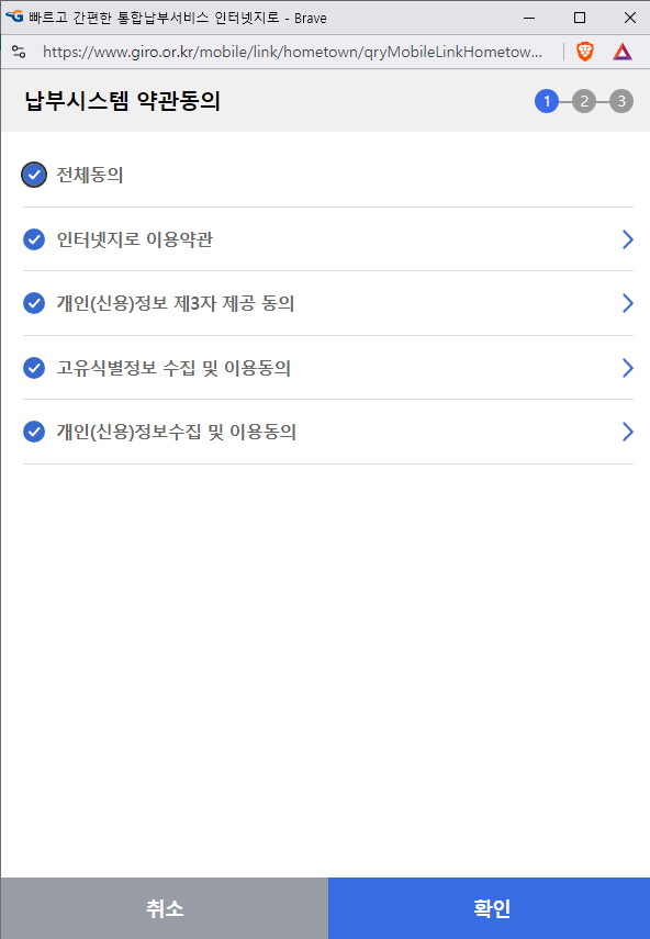 ✅ 8. 납부시스템 약관동의 '전체동의' 후 > '확인'