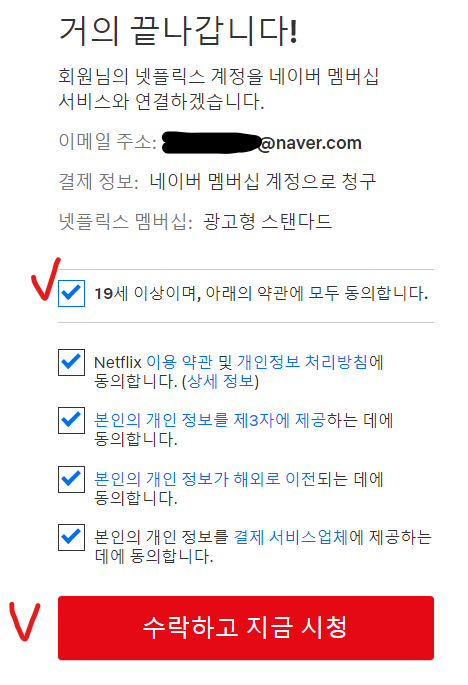 ✅ 약관 동의 후 > '수락하고 지금 시청' 클릭