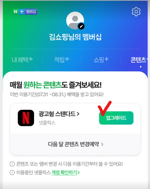네이버멤버쉽 MY 페이지 -> 콘텐츠 + -> 넷플릭스 '업그레이드' 클릭 -> 원하는 요금제 선택