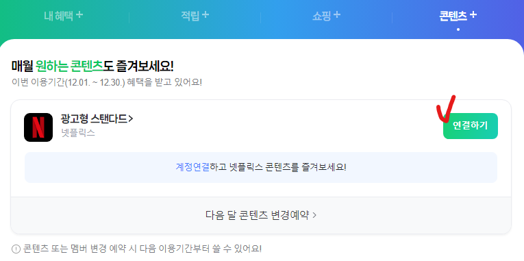 ✅ 네이버멤버십 플러스 > 콘텐츠+ > 넷플릭스 '연결하기' 버튼 클릭